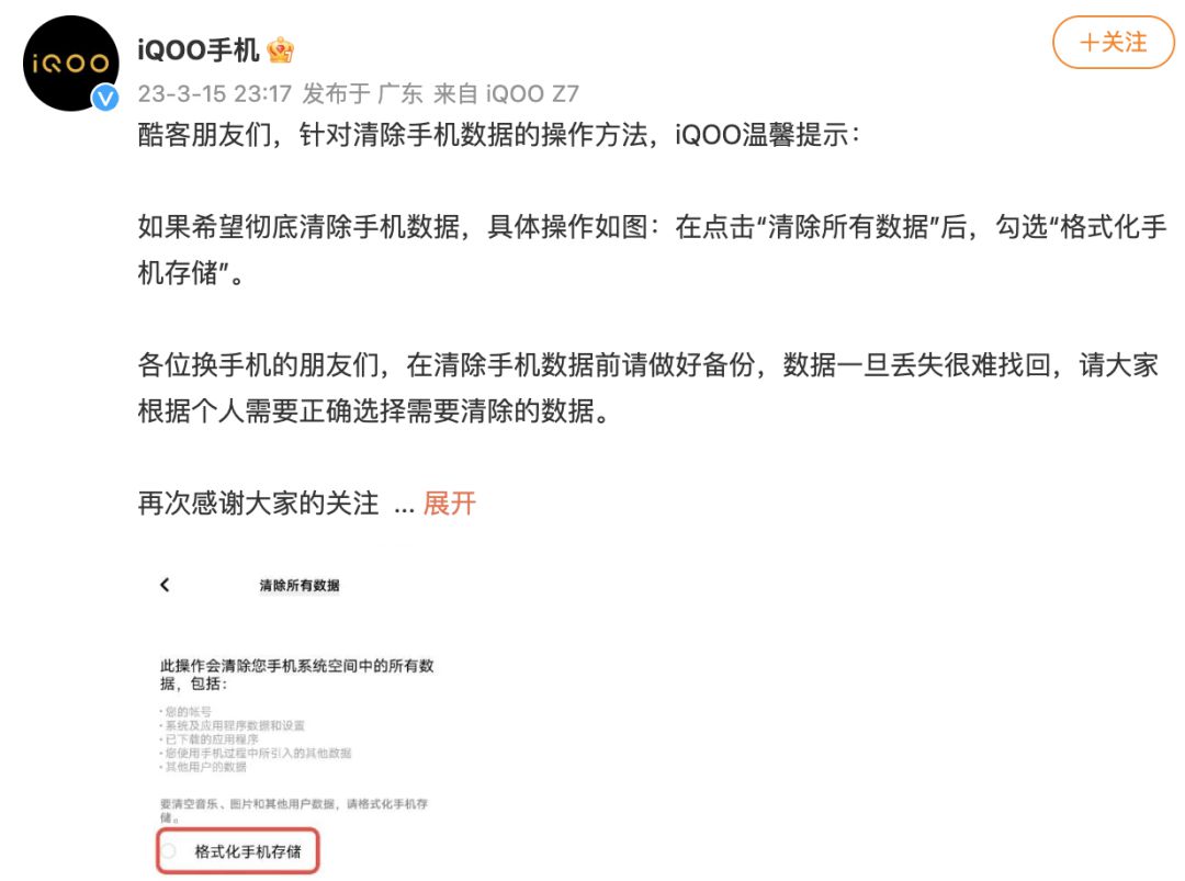 央视“3·15”晚会提醒消费者,恢复手机出厂设置,并非彻底清除手机数据。对此,iQOO手机官方微博15日晚发文: