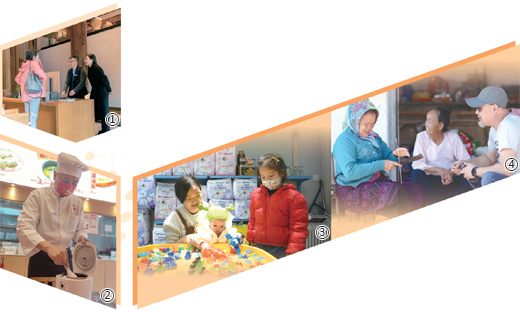 图①:范丽珍(右一)在民宿大堂内接待入住的客人。