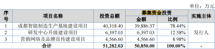 此次IPO,倍益康计划募集资金5.1亿元,募投项目包括:成都智能制造生产基地建设项目、研发中心升级建设项目、营销网络及品牌宣传建设项目。
