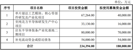 第三个募投项目——江苏启东半导体装备产业化基地二期项目,建成达成后将形成年产炉管、涂胶显影等集成电路设备50套,光伏工艺设备120套,面板制程设备10套,系统集成及工艺设备逾3000套,配套零部件逾30000套的生产规模。