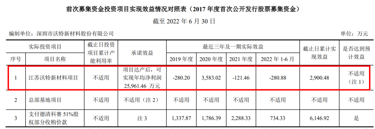 截至2022年6月30日,江苏沃特新材料项目未达产。对此,沃特股份解释称江苏沃特新材料项目是该公司基于IPO时的市场情况制定的募投项目,项目建设过程中,受下游行业需求阶段性变化,汽车等行业客户认证周期较长等因素影响,项目实际投资及建设进度较预期放缓,项目新建产能尚未完全达产,在项目是否达到预计效益一栏显示为“不适用”。