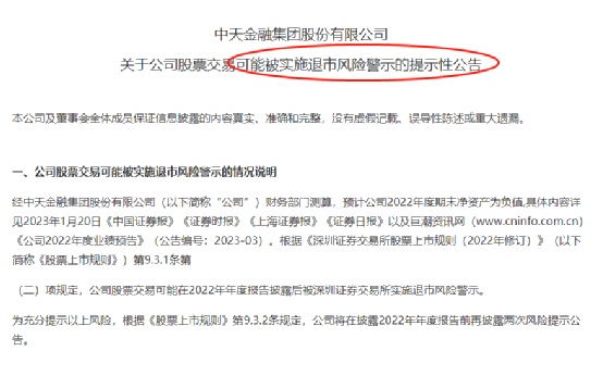 中天金融表示,预计公司2022年度期末净资产为负值,公司股票交易可能在2022年年报披露后被深交所实施退市风险警示。