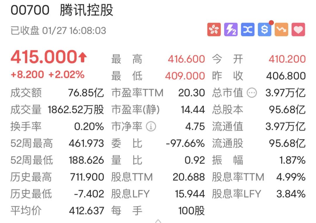 1月27日,腾讯控股股价续创11个月以来新高,盘中最高触及416.6港元/股,收盘报于415港元/股,涨幅2.02%。记者注意到,随着腾讯控股在去年10月股价触底后,券商纷纷调高其目标价,中泰国际证券在最近的一份报告中将其目标价上调至460港元/股。