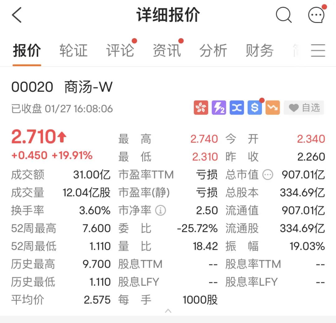 商汤一度涨超20%腾讯续创11个月来新高