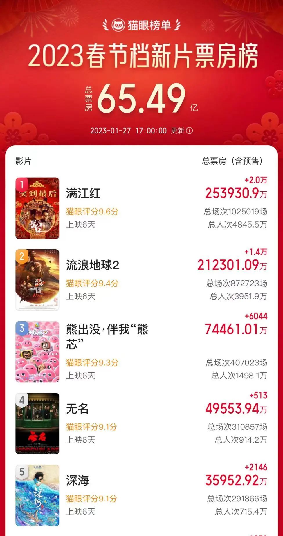 春节假期临近尾声,多项热点数据出炉,猫眼专业版数据显示,截至1月27日下午17时,2023年春节档新片总票房达65.49亿元,《满江红》《流浪地球2》《熊出没·伴我“熊芯”》继续分列春节档票房前三位,三部影片票房分别达25.4亿元、21.2亿元和7.45亿元。猫眼的预测数据显示,上述三部影片的内地总票房将分别达到45.07亿元、36.54亿元、12.65亿元。