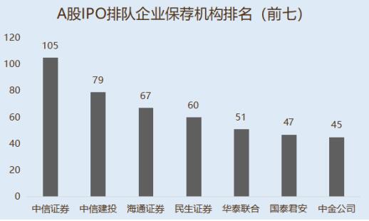 总体来看,中信证券总共参与105家排队企业的保荐工作名列第一,中信建投参与保荐79家IPO排队企业位居第二,其次分别是海通证券67家、民生证券60家、华泰联合51家、国泰君安47家和中金45家。