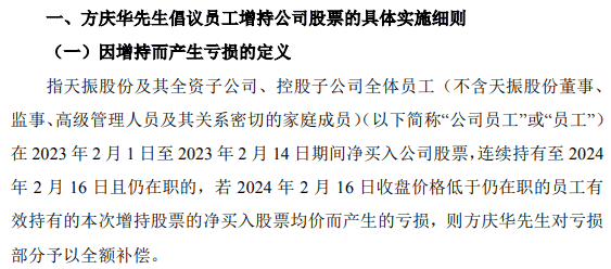 方庆华承诺,天振股份及全资子公司、控股子公司员工(不含天振股份董事、监事和高级管理人员及其关系密切的家庭成员)在2023年2月1日至2023年2月14日期间完成净买入天振股份股票,连续持有至2024年2月16日仍在职的员工,若因在前述期间增持天振股份股票产生的亏损,方庆华将以个人资金予以全额补偿;若有股票增值收益则归员工个人所有。