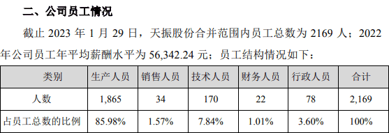 公开信息显示,截至2023年1月29日,天振股份合并范围内员工总数为2169人;2022年公司员工年平均薪酬水平为56342.24元。