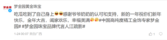 而@梦金园黄金珠宝 官微也现身评论区:“吃瓜吃到了自己身上感谢爷爷奶奶的认可和支持,新的一年祝你们新年快乐,金年大吉,阖家欢乐,幸福美满。”并且带上了广告#中国高纯度精工金饰专家梦金园# #梦金园珠宝品牌代言人江疏影#