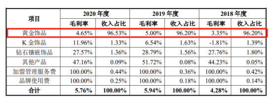 背后的原因是,梦金园虽然拥有黄金饰品、K金饰品、钻石镶嵌饰品、加盟管理服务费、品牌使用费等多元化的收入,但黄金饰品一直在收入中的占比高达96%,而黄金饰品又是这几类产品中毛利率最低的,这拖累了梦金园的整体毛利率水平。