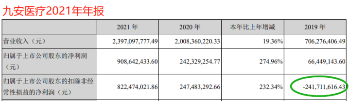 不得不说,九安医疗沾了疫情的大光,要知道,该公司2019年的营业收入仅有7.06亿元、净利润6644.91万元,扣非净利润则是出于亏损状态,为-2.42亿元,在当时来讲,主营业务可以说是巨亏。