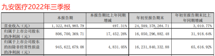 2022年,九安医疗的业绩则出现“井喷”,前三季度,该公司实现营业收入245.89亿元,同比增长30.1倍;实现净利润160.50亿元,同比增长319.19倍。