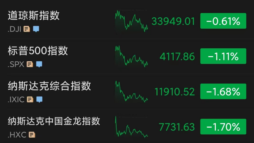 当地时间周三,美股三大指数低开低走,盘中小幅震荡。道指跌0.61%,报收33949.01点;纳指跌1.68%,收于11910.52点;标普500指数跌1.11%,报收4117.86点。