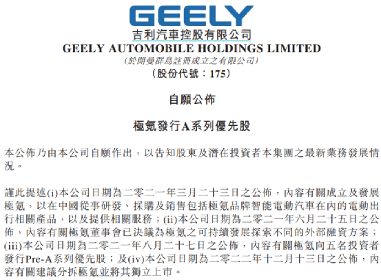 到了去年12月,吉利控股公开宣布,极氪已于2022年12月7日按保密基准向美国证监会递交可能进行首次公开发售的注册声明草拟本。建议分拆内容目前拟包括两项,即于美国发售极氪股份,和以实物方式向股东分派美国存托股票。