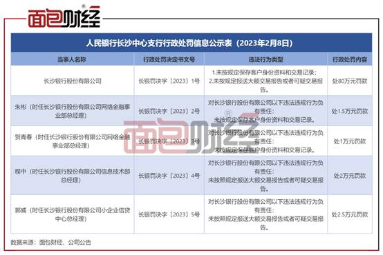 其中,长沙银行因未按规定保存客户身份资料和交易记录;未按规定报送大额交易报告或者可疑交易报告,被中国人民银行长沙中心支行罚款80万元。
