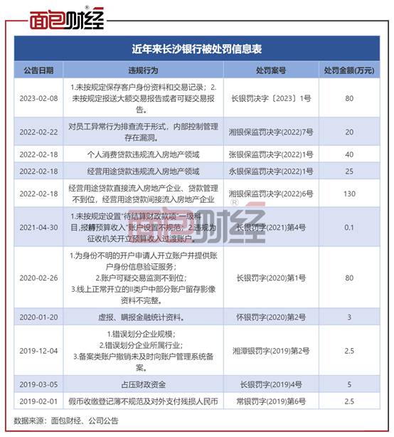以公告披露日统计,2019年至今,长沙银行累计被处罚11次,累计被处罚金额达388.1万元。其中,在2022 年2月18日,该行曾因经营用途贷款直接流入房地产企业、贷款管理不到位,经营用途贷款间接流入房地产企业原因被中国银保监会湖南监管局合计罚款130万元。