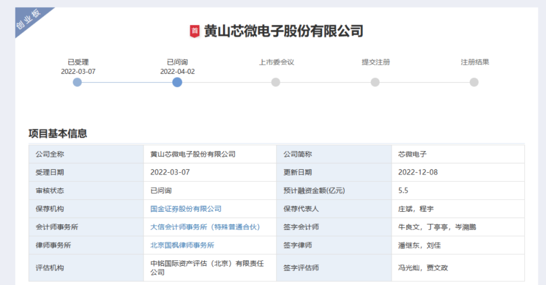 2022年3月,芯微电子向深交所递交申报材料,拟冲刺创业板IPO.中介机构的选择上,芯微电子的保荐券商为国金证券,会计所为大信会计师事务所,律所为北京国枫律师事务所。