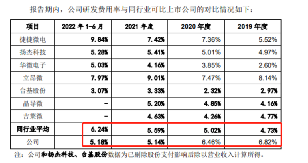 研发费用上,报告期内芯微电子的研发费用分别为 1,546.83 万元、1825.04 万元、2288.34 万元和 1123.52 万元,研发费用占营业收入的比例分别为 9.16%、7.96%、6.05%和 6.12%。剔除股份支付影响后,研发费用率分别为6.82%、6.46%、5.14%和 5.18%,低于同行业可比上市公司。