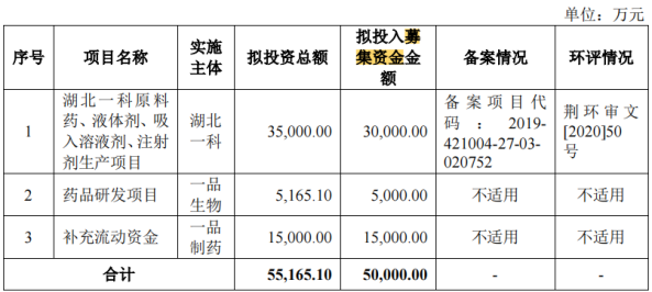 招股书显示,此次IPO,一品制药计划募集资金5亿元,3亿元将用于湖北一科原料药、液体剂、吸入溶液剂、注射剂生产项目,5000万元用于药品研发项目,1.5亿元用于补充流动资金。