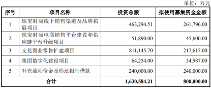 本次募投的珠宝时尚线下销售渠道及品牌拓展项目预计总投资463294.51万元,拟使用募集资金261796万元,主要投向老庙亚一品牌直营门店扩张、老庙亚一品牌存量直营门店迭代升级、老庙亚一品牌加盟渠道建设、老庙品牌国际化、露璨品牌门店拓展、茱瑞品牌门店拓展等6个方向。