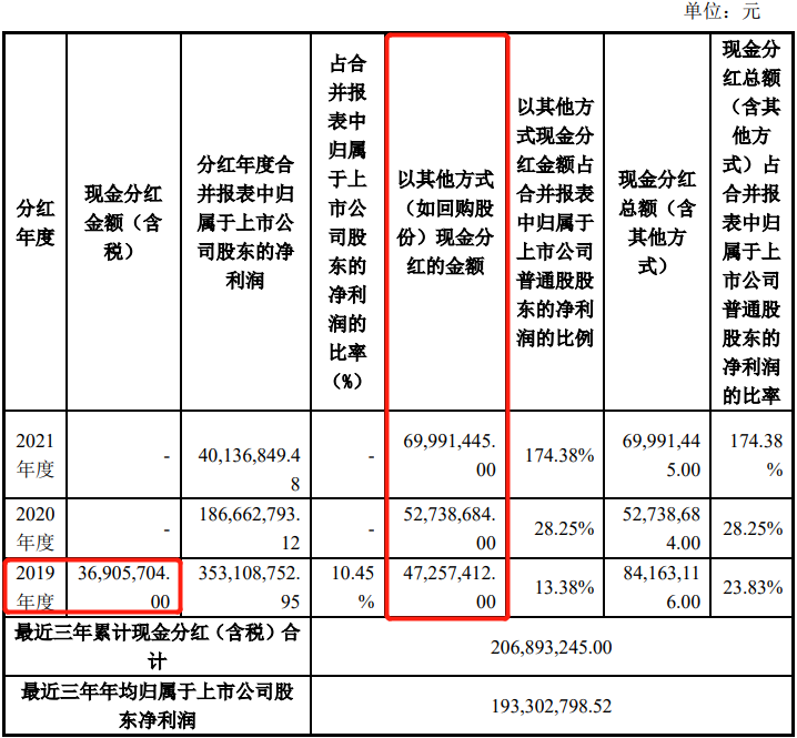 《电鳗财经》注意到,国光电器的分红方式很有“特色”,2019年至2021年分红总金额高达2.0689亿元,但仅在2019年进行了直接的现金分红,向全体股东每10股派0.8元,分红总额3690.57万元,2020年和2021年均不派发现金红利、不送红股、不以资本公积金转增股本。同时,该公司3年中均通过股票回购等方式进行了分红,合计金额1.6999亿元。