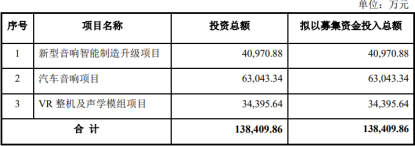 第三个募投项目——VR整机及声学模组项目使用资金规模34395.64万元,建设期为24个月,建成达产后年产VR整机100万套,声学模组2400万套。项目税后内部收益率为23.11%,税后静态投资回收期(含建设期)为7.27年。