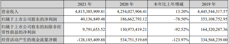 《电鳗财经》关注到,2019年至2021年,国光电器业绩处于持续下滑状态,利润萎缩的极为严重,其中净利润从3.53亿元下降至4000余万元,扣非净利润则不足千万元。