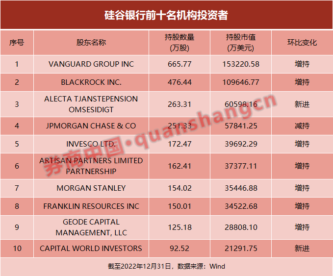 另外,据证券时报·券商中国记者统计,截至2022年末,共有528家机构投资者持有硅谷银行股票,合计持有市值109.54亿美元。其中,持股数量最多的是全球最大的公募基金先锋集团(VANGUARD GROUP INC),持股市值高达15.32亿美元,此外,贝莱德(BLACKROCK INC.)、摩根大通(JPMORGAN CHASE & CO)、景顺(INVESCO LTD.)等知名全球投资机构均大量持有硅谷银行的股票,28家机构投资者持有硅谷银行均过亿美元。