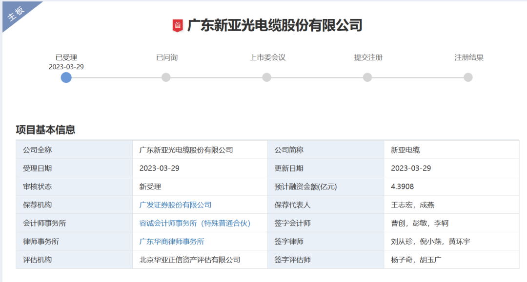 3月30日,上交所发行上市审核项目动态显示,已于当天受理了金盛海洋的首发申请,前一天,3月29日,深交所受理了新亚电缆的首发申请。