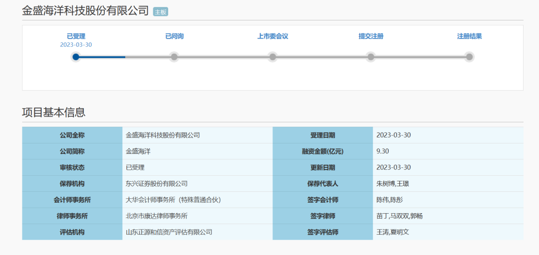 其中,上交所受理的首家主板新申报企业为金盛海洋,该公司发行股数不超过3334万股,占发行后总股本比例不低于25%,预计融资金额为9.3亿元。