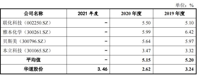 值得注意的是,华道股份的研发费用率落后于同行可比公司2个百分点,2019年和2020年,其可比公司的研发费用率均值分别为5.2%和5.15%。