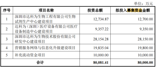 此外,值得注意的是,达科为还存在重复补充流动资金的情况。招股书显示,达科为此次IPO拟将10000万元募集资金直接用于补充流动资金,将12700万元用于深圳市达科为生物工程有限公司生物试剂生产中心建设项目(以下简称生物试剂项目),将9350万元用于达科为(深圳)医疗设备有限公司医疗设备制造中心建设项目(以下简称:医疗设备项目),将28150万元用于研发中心建设项目,将19800万元用于营销服务网络与信息化升级建设项目。