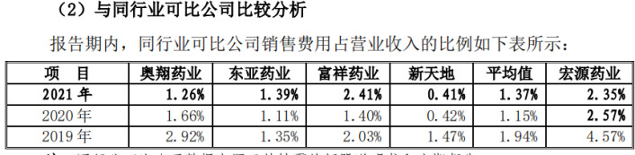 招股书显示,从2019年至2021年(以下简称报告期),宏源药业的销售费用分别为7191.13万元、3345.12万元和3700.98万元,同期该公司的销售费用占营业收入的比例分别为4.57%、2.57%和2.35%,同期行业平均值分别为1.94%、1.15%和1.37%。由此可见,报告期内,宏源药业的销售费用占营业收入的比例明显高于同行公司。