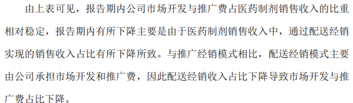 以上前后矛盾的描述让人不得不质疑,宏源药业将“市场开发与推广费占比下降”归于“配送经销实现的销售收入占比有所下降”的解释有些站不住脚。