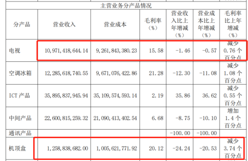四川长虹电视业务实现营业收入109.71亿元,同比下降 1.46%;机顶盒收入下滑24.24%。