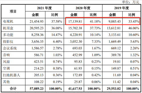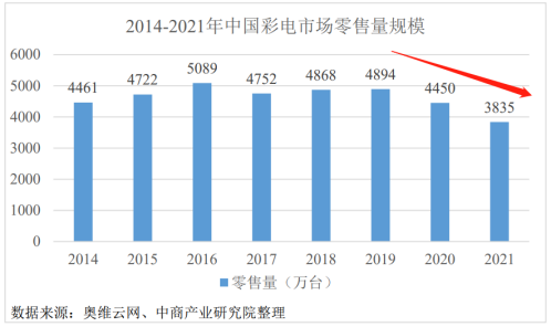 招股书显示,彩电市场规模及竞争状况变化情况经历了多年的连续、快速增长之后,彩电行业进入存量市场阶段且逐步进入调整期。彩电市场已经从满足刚需的功能性消费转向满足改善型、享乐型需求的品质性消费。人工智能、全能屏、70英寸以上的超大尺寸电视等是未来彩电的发展趋势。根据奥维云网统计数据显示,2020年以来,中国彩电市场零售量呈下降趋势,2021年为3835万台,国内彩电市场竞争激烈,零售规模呈下降趋势。