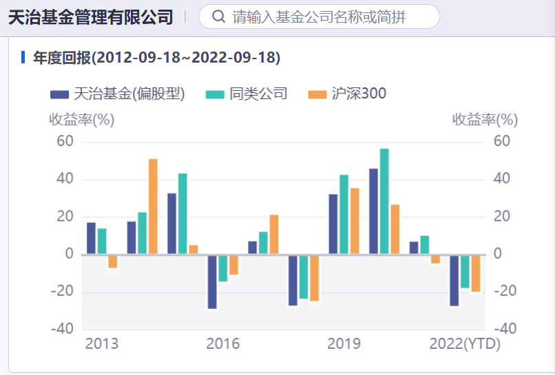 2014年,天治基金旗下的偏股基金平均收益率为18.20%,跑输同类基金平均业绩23.11%,更是跑输同期沪深300指数51.66%的涨跌幅,在可比的67家基金公司中排名第48,居三分之一。2015年、2017年、2019年、2020年、2021年,偏股基金均取得正收益,年均收益率分别为43.88%、12.72%、43.14%、57.18%、10.65%,但天治基金旗下的偏股基金平均收益率分别为33.27%、7.68%、32.78%、46.44%、7.45%,在基金公司中的排名均殿后。