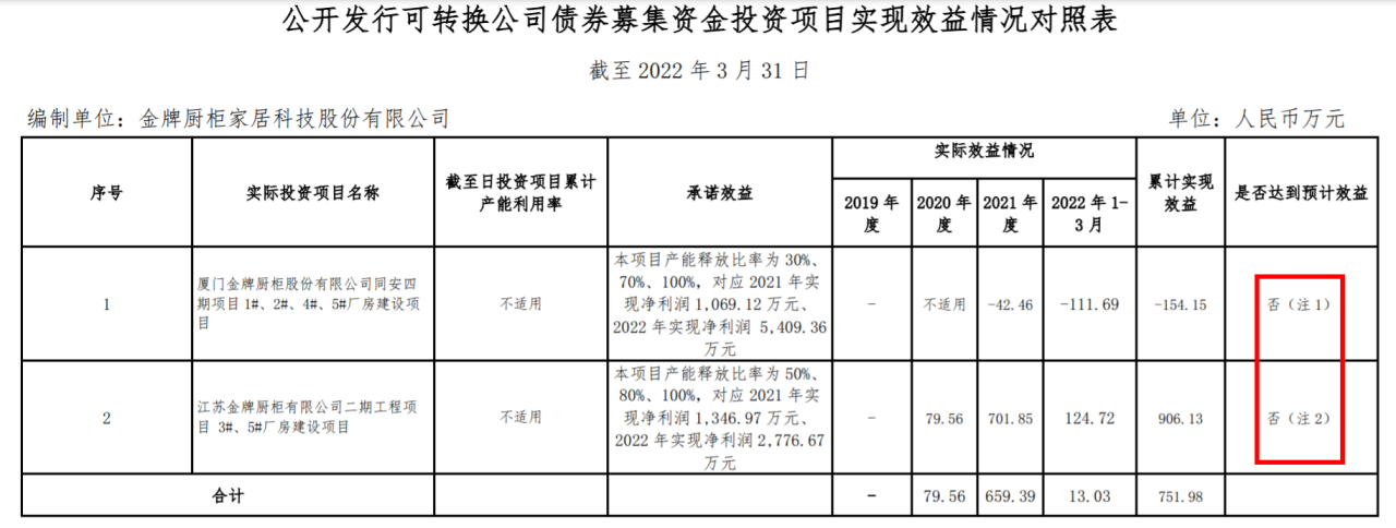 2019年公开发行可转换公司债券包含两个募投项目,厦门金牌厨柜股份有限公司同安四期项目1#、2#、4#、5#厂房建设项目承诺效益为产能释放比率为30%、70%、100%,对应2021年实现净利润1069.12万元、2022年实现净利润5409.36万元,但实际效益为2021年、2022年1-3月实现净利润-42.46万元、-111.69万元,截至2022年1-3月累计实现效益为-154.15万元,未达预期。对此,金牌橱柜解释为项目于2021年10月投产,尚处于爬坡期;受疫情及下游地产景气度影响,阶段性销售收入增速不及预期;受销售季节性影响,一季度属于销售淡季,成本费用较高。