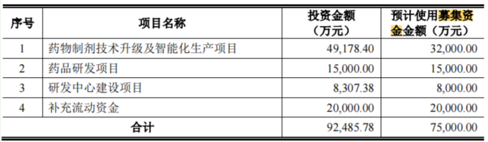 此次冲刺创业板IPO,诺康达计划募集资金7.5万元,其中3.2亿元将用于药物制剂技术升级及智能化生产项目,1.5亿元将用于药品研发项目,8000万元将用于研发中心建设,2亿元将用于补充流动资金。