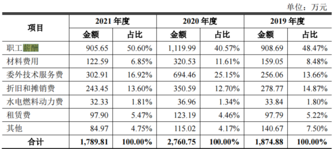 此外,值得注意的是,报告期内,该公司研发费用中的职工薪酬分别为908.69万元、1119.99万元和905.65万元。