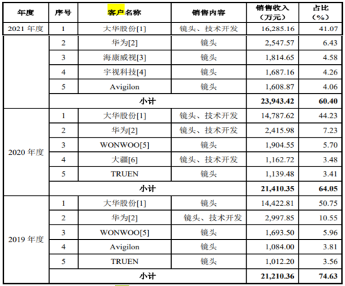 从上表不难发现,中润光学营业收入主要来自于大华股份、华为、大疆等公司。并且,大华股份是该公司连续3年的第一大客户;2019年至2021年,该公司销售金额占营业收入的比例分别为50.75%、44.23%和41.07%。