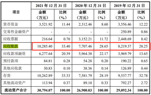 招股书显示,中润光学2019年至2021年应收账款账面价值分别为8219.37万元、7707.46万元及约1.03亿元,占流动资产的比例分别为28.25%、28.65%及33.4%,占营业收入的比例分别为28.92%、23.05%及25.94%。据了解,一般IPO相关公司应收账款占比较高的企业约在20%左右,而中润光学明显高于20%。