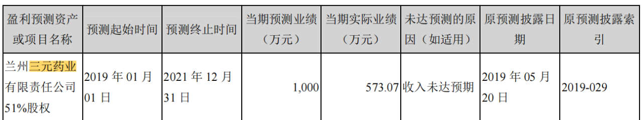 在当时收购时,交易对方方承诺三元药业2019年至2021年对应的主营业务收入分别为不低于6000万元、8000万元、10000万元,扣除非经常性损益后的净利润分别不低于600万元、800万元、1000万元。但三元药业并未达到业绩承诺的标准。