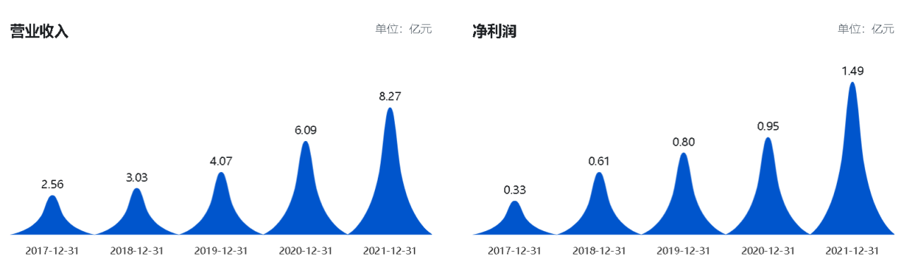 2019年-2021年,汇创达实现营业收入分别为4.07亿元、6.09亿元、8.27亿元,同期净利润分别为0.80亿元.0.95亿元、1.49亿元,该公司的营收与净利持续增长。