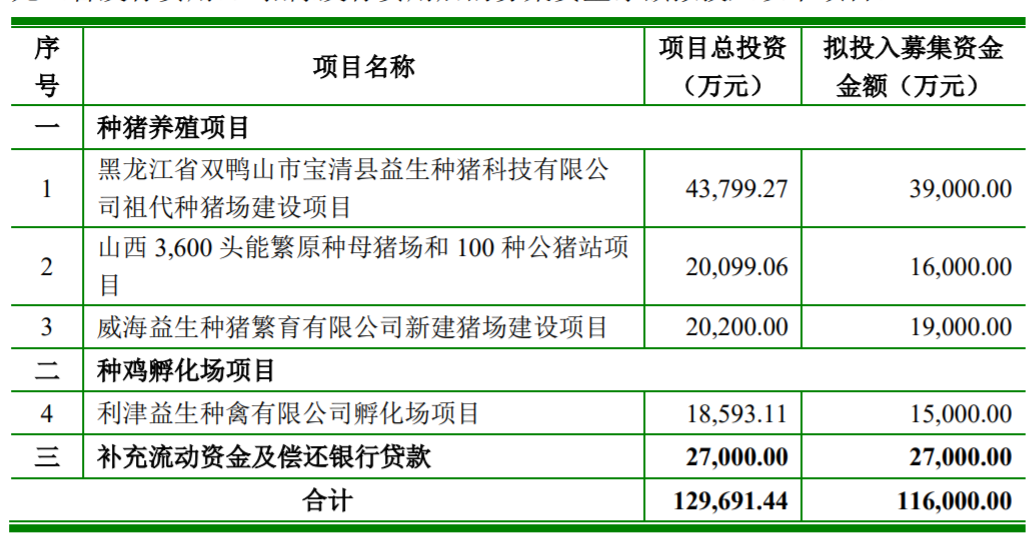 为满足生猪养殖企业规模化供种的需要,此次募集资金主要投向高代次种猪繁育项目。其中黑龙江省双鸭山市宝清县益生种猪科技有限公司祖代种猪场建设项目计划总投资额为 4.38亿元,项目全部达产后预计年实现销售收入4.55亿元,净利润9371.83万元。山西 3600头能繁原种母猪场和100种公猪站项目计划总投资额为2.01亿元,项目全部达产后预计年实现销售收入1.33亿元,净利润3331.13万。威海益生种猪繁育有限公司新建猪场建设项目计划总投资额为2.02亿元,项目全部达产后预计年实现销售收入1.33亿元,净利润3331.13万元。