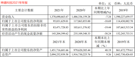 据神通科技年报信息,该公司最近三年的业绩保持着连续下滑的态势。该公司每年的营业收入以1亿元左右规模萎缩,2019年至2021年营业收入分别为15.9亿元、14.86亿元和13.79亿元。
