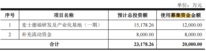 招股书显示,此次IPO,麦士德福计划募集资金2亿元,其中1.2亿元将用于麦士德福研发及产业化基地(一期)的投资建设,8000万元将用于补充流动资金。