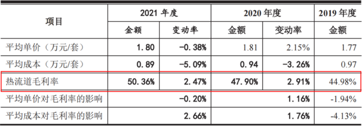 由此可见,来自热流道系统的营业成本呈逐年上升趋势。然而,蹊跷的是,在营业成本逐年上涨的情况下,热流道系统成单价成本从2020年的0.94万元/套下降了到了2021年的0.89万元/套,下降了5.09%。