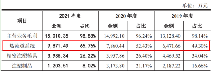 在麦士德福的营业成本占比中,其来自热流道系统的毛利占比最高,报告期内分别为6471.66万元、7860.44万元和9871.49万元,占总营业成本的比例分别为49.3%、52.43%和65.76%。