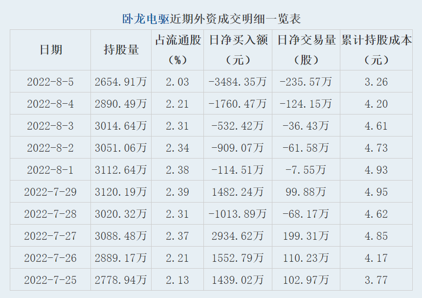 同花顺数据显示,8月5日,卧龙电驱获外资卖出235.57万股,占流通盘0.18%。截至目前,陆股通持有卧龙电驱2654.91万股,占流通股2.03%,累计持股成本3.26元,持股盈利379.09%。